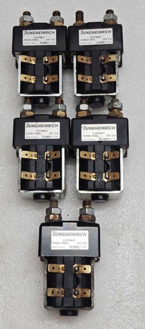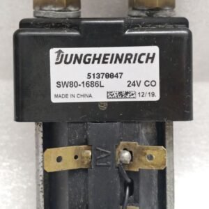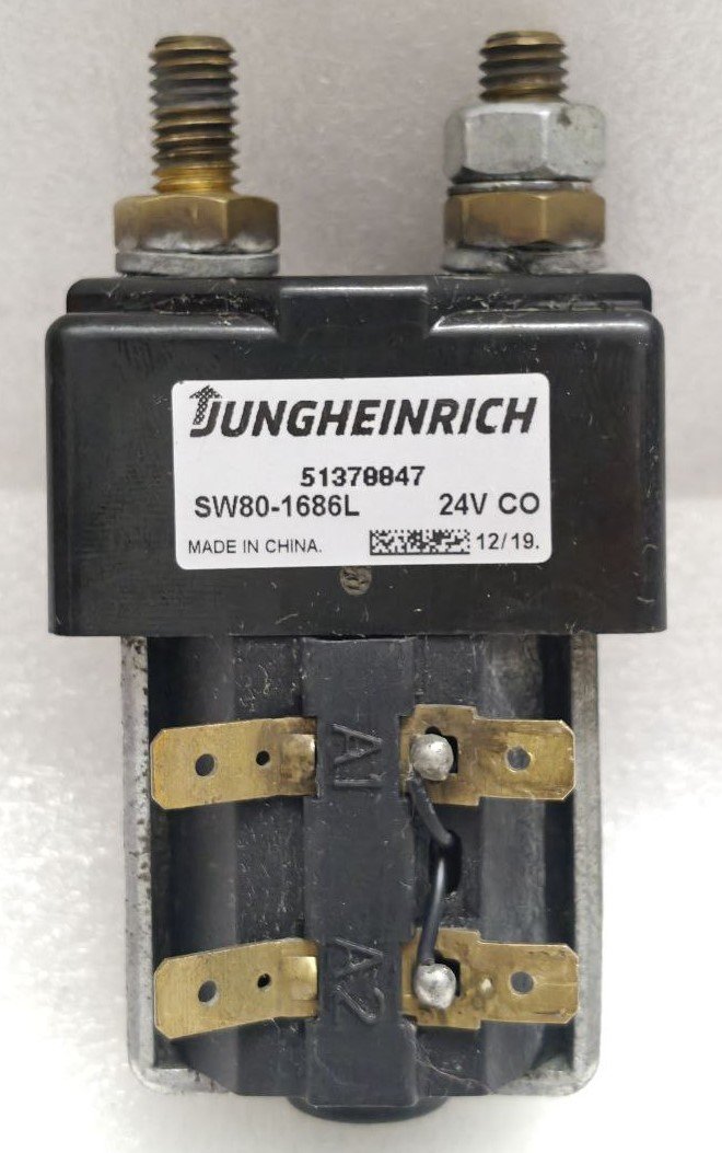 The CONTACTOR SW80-1686L is a genuine OEM component manufactured for Jungheinrich electric forklifts, pallet trucks, and other material handling equipment. This heavy-duty electromagnetic contactor functions as a remotely operated switch, designed to handle the high-current loads required for critical functions such as the travel motor, hoist motor, or power circuit control. Part number 51370047 is the specific identifier used by Jungheinrich for this component.